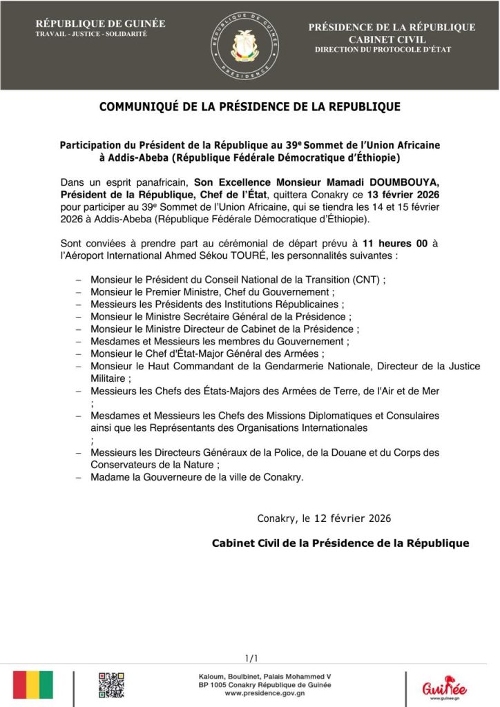 Attendu à ce 39e sommet de la plus grande institution africaine, Mamadi Doumbouya quittera Conakry ce vendredi 13 février 2026, comme l’indique le cabinet presidentiel dans ce communiqué ci-dessous.