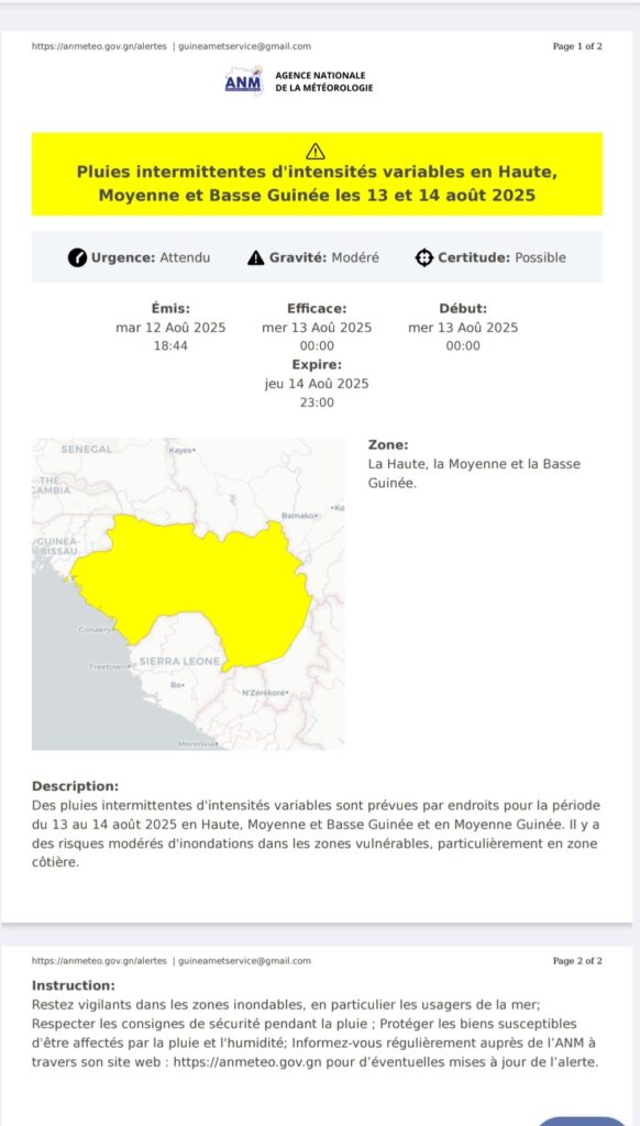 « Des pluies intermittentes d’intensités variables sont prévues par endroits dans la période du 13 au 14 août 2025, en Haute, Moyenne et Basse Guinée. Il y a des risques modérés d’inondations dans les zones vulnérables, particulièrement dans les zones côtières. » A-t-elle alerté dans ce bulletin.