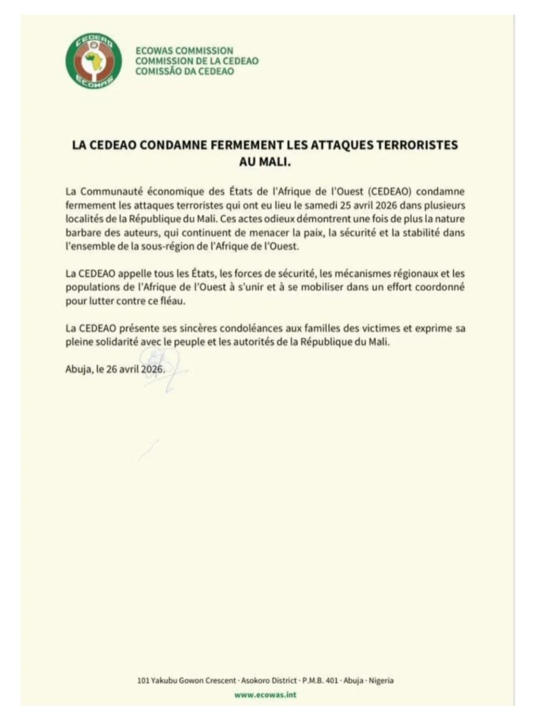 Face à cette situation, la Communauté économique des États de l’Afrique de l’Ouest (CEDEAO) a réagi à travers un communiqué officiel. L’organisation sous-régionale y exprime sa ferme condamnation des attaques perpétrées et réaffirme son engagement en faveur de la lutte contre le terrorisme dans l’espace ouest-africain.