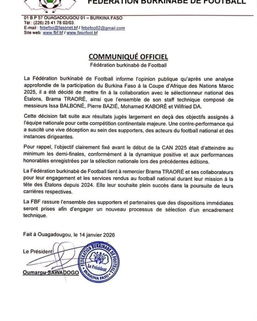 La Fédération Burkinabè de football (FBF) a annoncé, ce mercredi 14 janvier 2026, la fin de sa collaboration avec le sélectionneur national des Étalons, Brama Traoré. Par ailleurs, la FBF met fin à la collaboration avec l’ensemble de son staff technique.