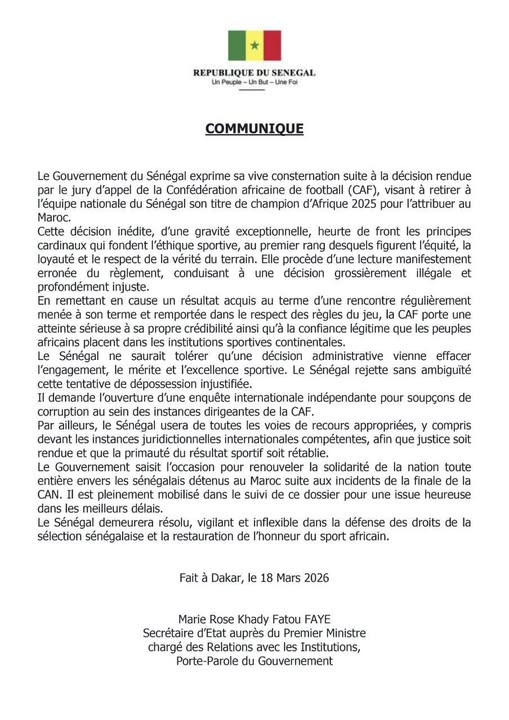 Le ton est grave, la colère est palpable. Dans un communiqué officiel au vitriol, le gouvernement du Sénégal a exprimé sa vive consternation après la décision du jury d’appel de la Confédération africaine de football (CAF) de retirer au Sénégal son titre de champion d’Afrique 2025 au profit du Maroc.