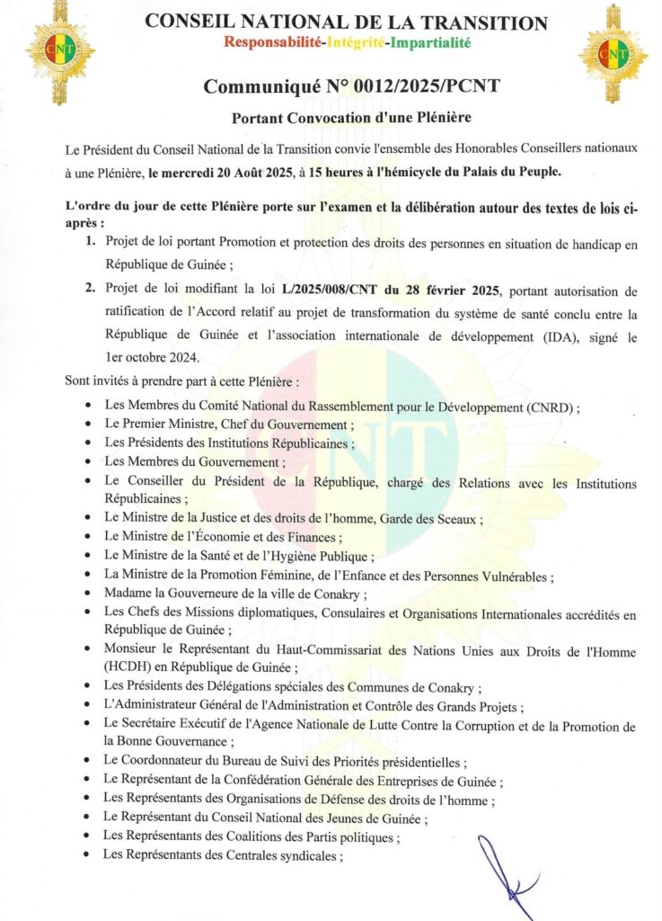 Le Président du Conseil National de la Transition (CNT) a convié l’ensemble des Honorables Conseillers nationaux à une Plénière prévue le mercredi 20 août 2025, à partir de 15 heures, dans l’hémicycle du Palais du Peuple.