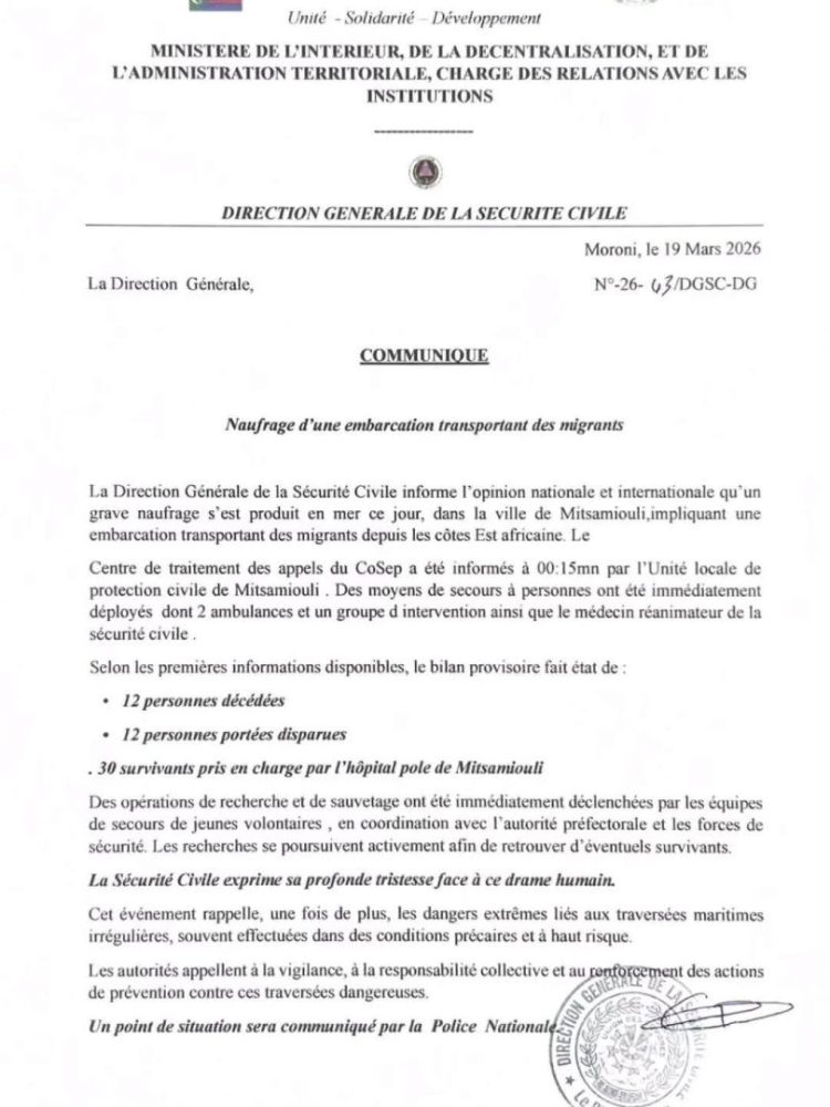 Une nouvelle tragédie migratoire frappe les côtes comoriennes. Dans la nuit de mercredi à jeudi, une embarcation de fortune transportant une cinquantaine de migrants a chaviré au large de Mitsamiouli, sur l’île de Grande Comore. Selon les dernières informations communiquées par la Direction Générale de la Sécurité Civile et relayées par plusieurs médias locaux, le bilan provisoire fait état d’au moins 12 personnes décédées, 12 portées disparues et 30 survivants secourus et pris en charge à l’hôpital de Mitsamiouli.
