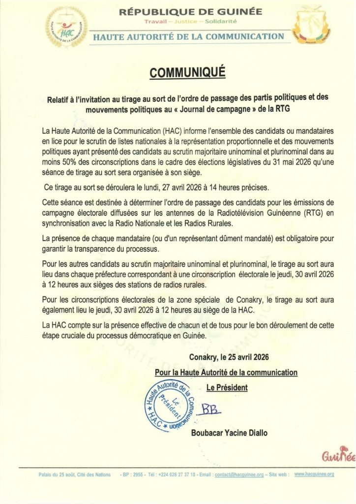 En prélude des élections législatives prévues le 31 mai 2026, la Haute Autorité de la Communication (HAC) franchit une nouvelle étape dans l’organisation du processus électoral. L’institution annonce la tenue imminente du tirage au sort déterminant l’ordre de passage des partis et mouvements politiques au « Journal de campagne » diffusé sur les antennes de la Radiotélévision Guinéenne (RTG).