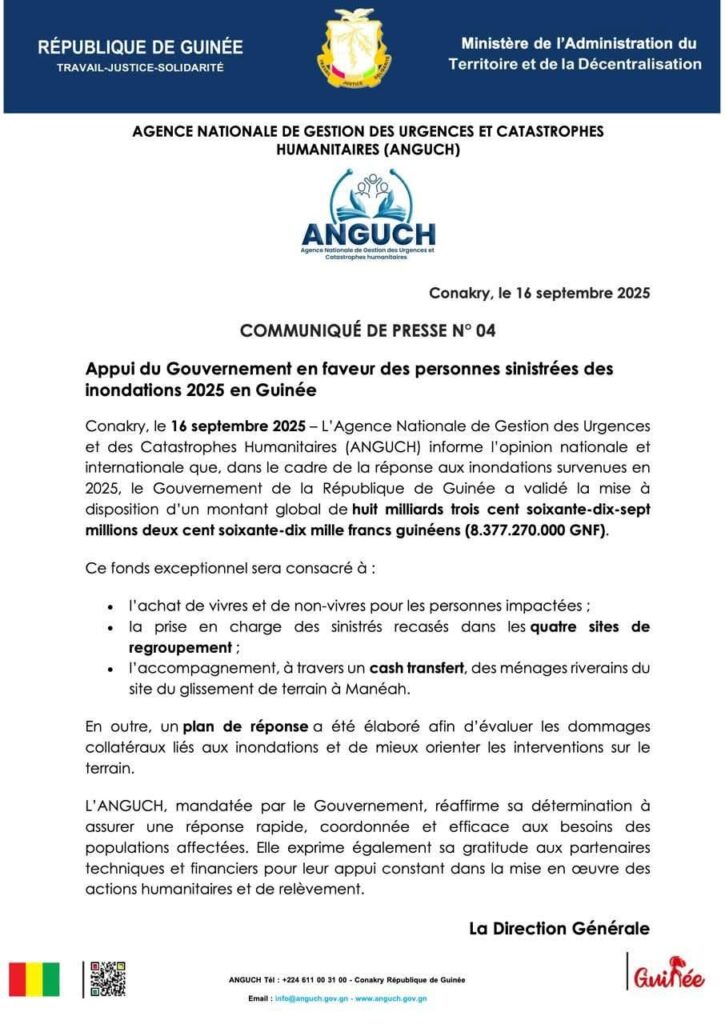 Dans le cadre de la réponse aux inondations survenues en 2025, le Gouvernement Guinéen a validé la mise à disposition d’un montant global de huit milliards trois cent soixante-dix-sept millions deux cent soixante-dix mille francs guinéens (8.377.270.000 GNF).