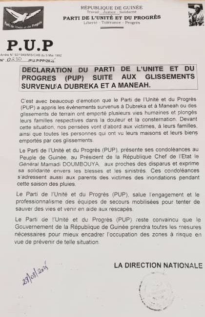 Dans une déclaration rendue publique ce samedi 23 août 2025 à son siège, le Parti de l’Unité et du Progrès (PUP), dirigé par El Hadj Fodé Bangoura, a exprimé sa profonde compassion à l’État guinéen et aux familles touchées par les tragiques glissements de terrain survenus à Dubréka et à Manéah, dans la préfecture de Coyah.