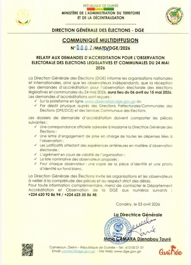 À travers un communiqué publié ce lundi 6 avril 2026, la Directrice Générale des Élections, Mme Camara Djenabou Touré, informe les organisations nationales, internationales ainsi que les observateurs indépendants que les opérations de réception des candidatures se dérouleront du 06 avril au 15 mai 2026.
