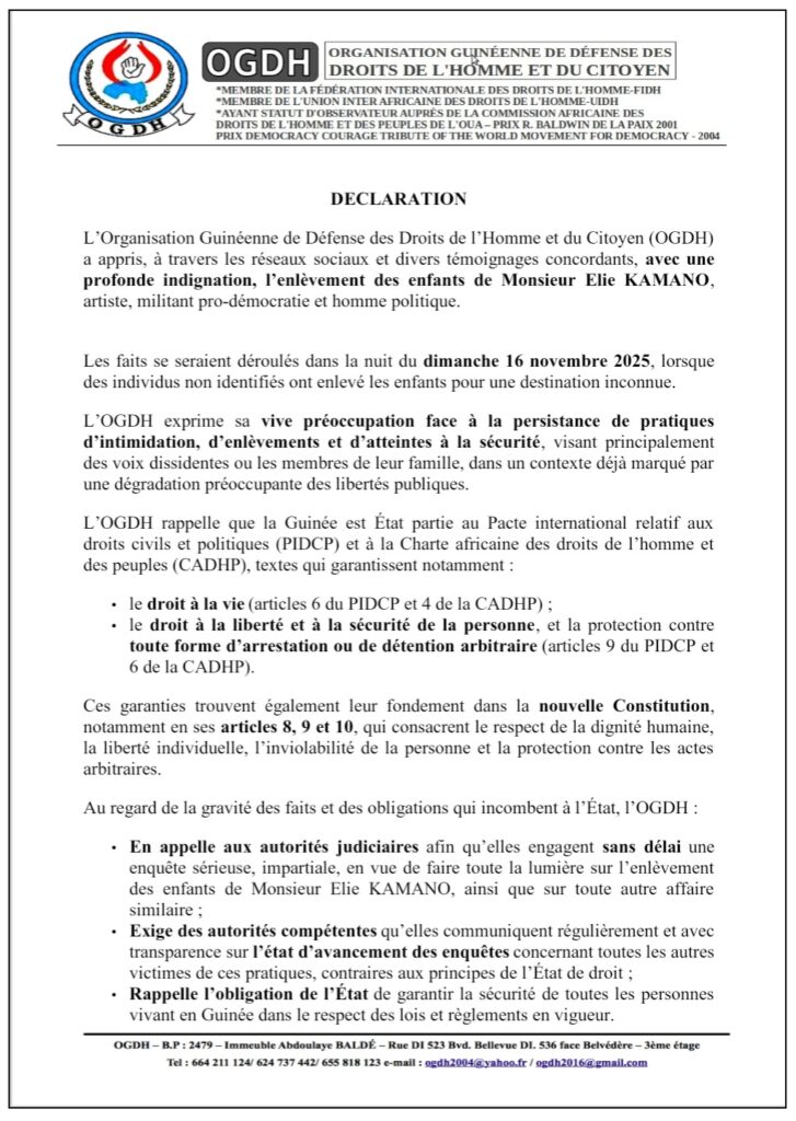 À travers un communiqué rendu public ce mardi, 18 novembre 2025, l’Organisation Guinéenne de Défense des Droits de l’Homme et du Citoyen (OGDH) condamne avec force l’enlèvement, dans la nuit du 16 novembre 2025, des enfants de l’artiste et homme politique Elie Kamano, un acte attribué à des individus non identifiés.