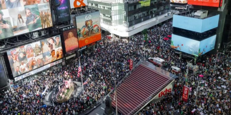 De New York à San Francisco en passant par Chicago, La Nouvelle-Orléans ou encore des petites villes du centre des États-Unis, des foules immenses ont envahi les rues de nombreuses villes américaines, ce samedi 18 octobre. Mot d’ordre : faire entendre leur opposition à Donald Trump lors d’une journée de mobilisation nationale dépeinte par la droite conservatrice comme un mouvement « de haine de l’Amérique ». Environ 7 millions de personnes ont pris part à plus de 2 700 rassemblements, selon les organisateurs.