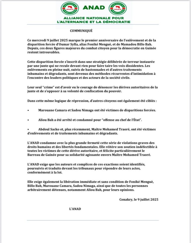 Conakry, 9 juillet 2025 – Un an jour pour jour après la disparition forcée d’Oumar Sylla, alias Foniké Menguè, et de Mamadou Billo Bah, tous deux membres du Front National pour la Défense de la Constitution (FNDC), l’Alliance Nationale pour l’Alternance et la Démocratie (ANAD) tire une nouvelle fois la sonnette d’alarme.