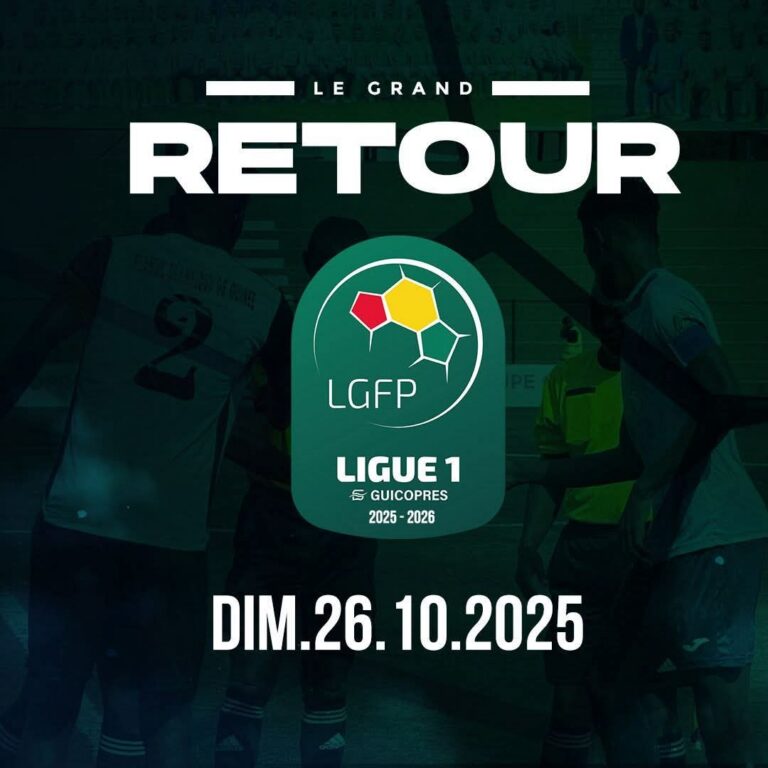 La Ligue guinéenne de football professionnel (LGFP) a annoncé, ce lundi 20 octobre 2025, sur sa page Facebook officielle, le coup d’envoi de la nouvelle saison du championnat national de Ligue 1. Selon cette communication, la saison 2025-2026 débutera ce dimanche 26 octobre sur l’ensemble des stades du pays.