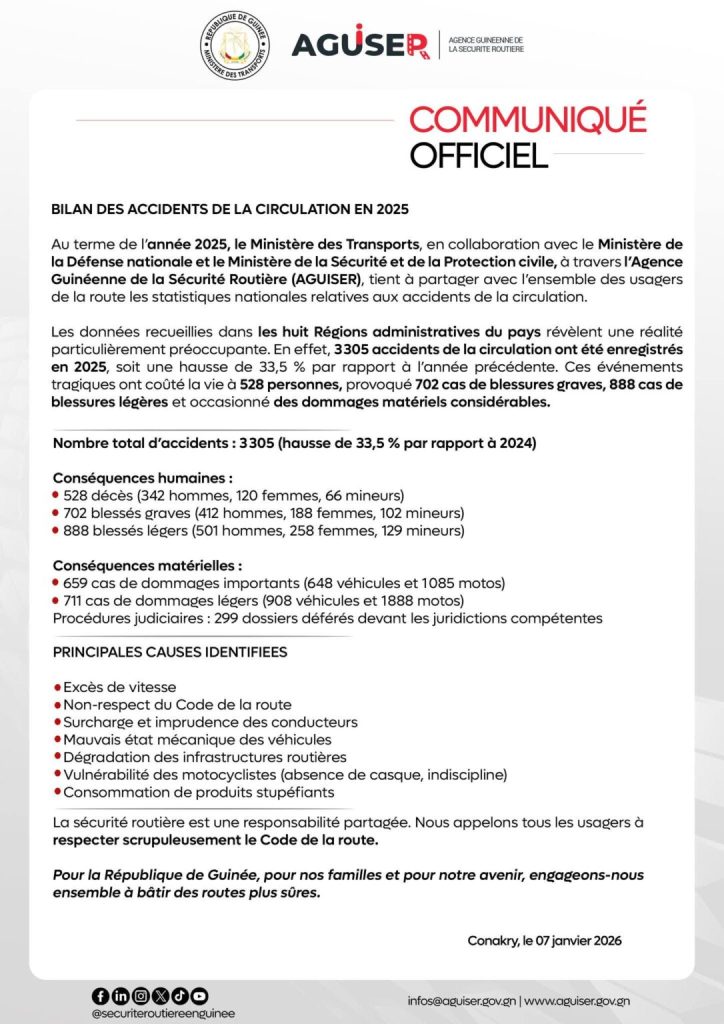 Au terme de l’année 2025, le Ministère des Transports, en collaboration avec le Ministère de la Défense nationale et le Ministère de la Sécurité et de la Protection civile, a rendu public le bilan national des accidents de la circulation, soulignant l’ampleur des accidents circulation Guinée 2025. Ces statistiques sont compilées par l’Agence Guinéenne de la Sécurité Routière (AGUISER) à travers un communiqué officiel. Les chiffres portent sur l’ensemble de l’année civile 2025. Ils concernent les huit régions administratives du pays. Le constat dressé par les autorités se révèle particulièrement préoccupant.