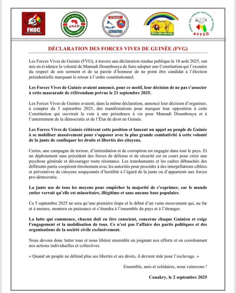 Les Forces Vives de Guinée avaient, dans la même déclaration, annoncé leur décision d’organiser, à compter du 5 septembre 2025, des manifestations pour marquer leur opposition à cette Constitution qui ouvrirait la voie à une présidence à vie pour Mamadi Doumbouya et à l’enterrement de la démocratie et de l’État de droit en Guinée.