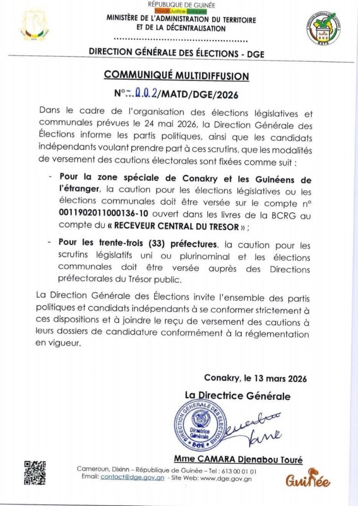 En prélude des élections législatives et communales en Guinée prévues pour le 24 mai 2026, la Direction Générale des Élections (DGE) vient de franchir une étape décisive. Dans un communiqué publié ce mois-ci, l’instance du MATD a officiellement fixé les modalités de versement des cautions électorales pour les partis politiques et les candidats indépendants. Entre comptes bancaires à la BCRG et Directions préfectorales du Trésor, voici les détails…Communiqué…