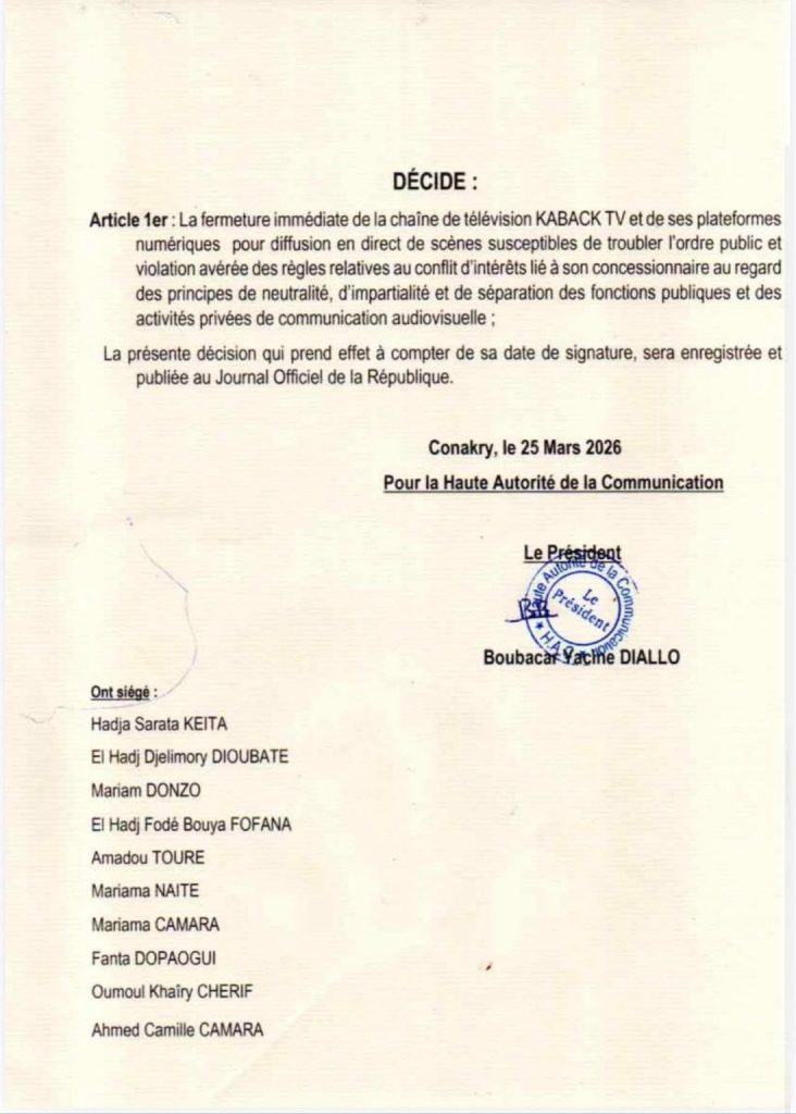 Dans une décision prise ce mercredi 25 mars 2026, la Haute Autorité de la Communication a décidé de la fermeture immédiate de la chaîne de télévision KABACK TV et de ses plateformes numériques.