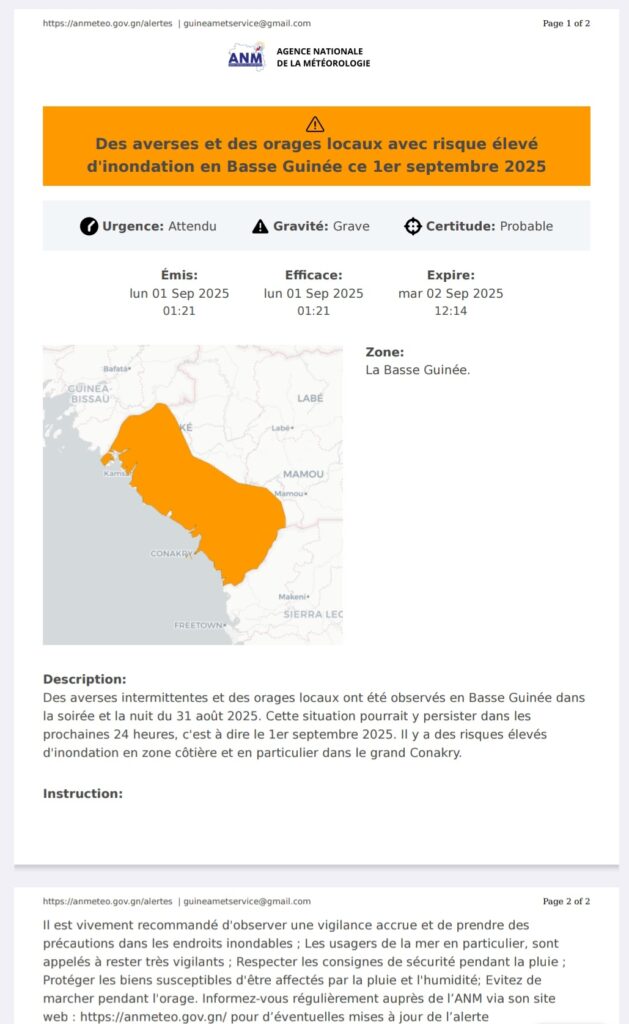L’Agence Nationale de la Météorologie annonce des pluies Modérées intermittentes en Basse et Moyenne Guinée ce mercredi 03 septembre 2025. Ce phénomène jugé possible sera obserté par endroits dans ces deux régions jusqu’à 23H00.