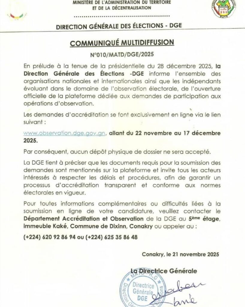 La Direction Générale des Élections annonce l’ouverture officielle de la plateforme dédiée aux demandes d’accréditation pour l’observation de la présidentielle du 28 décembre 2025. Les organisations nationales, internationales et observateurs indépendants sont invités à soumettre leurs candidatures exclusivement en ligne du 22 novembre au 17 décembre 2025.