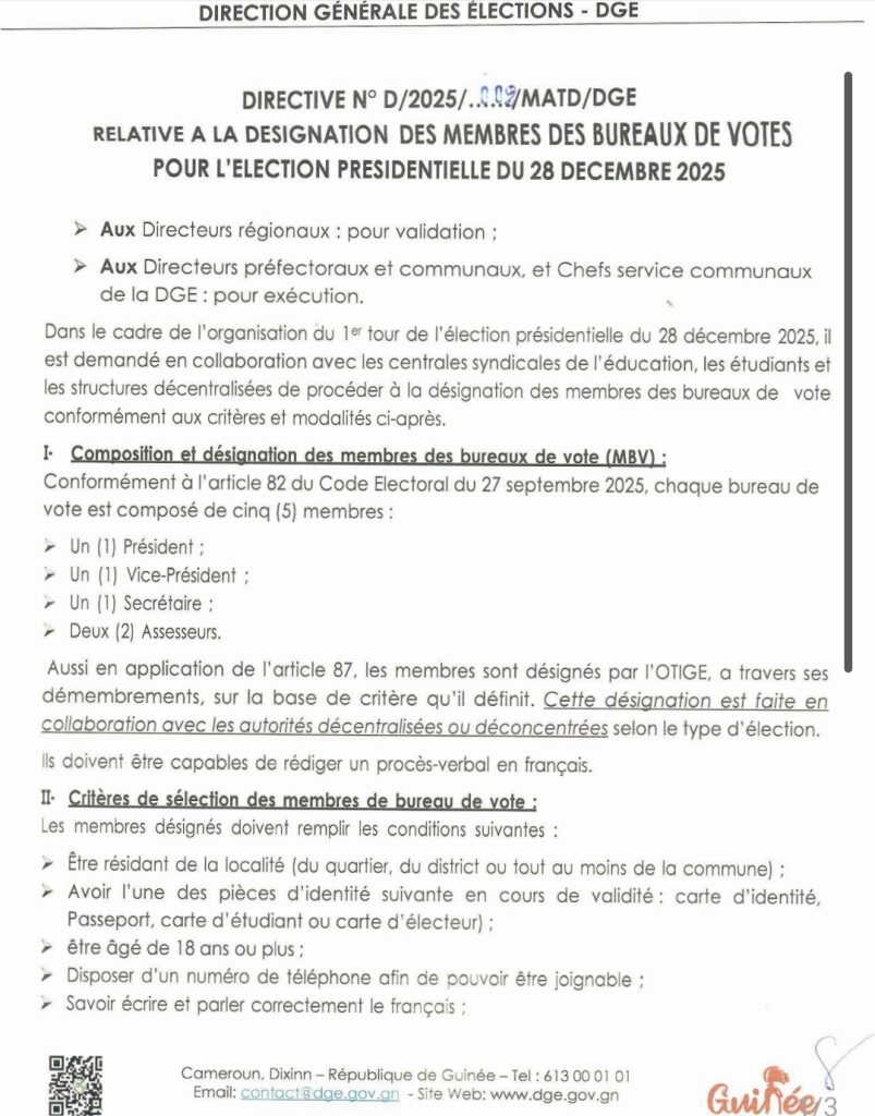 La Direction générale des élections (DGE) a publié une directive sur la désignation des membres des bureaux de vote pour l’élection présidentielle du 28 décembre 2025. Cette directive inclut des détails sur la rémunération des agents électoraux.
