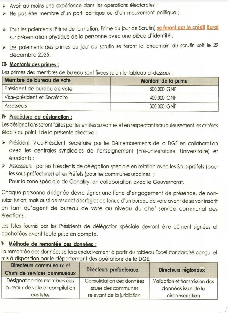 Les primes sont fixées à 500 000 GNF pour les présidents, 400 000 GNF pour les vice-présidents et secrétaires, et 300 000 GNF pour les assesseurs. Les paiements, assurés par le Crédit rural sur présentation d’une pièce d’identité, incluent la formation et le jour du scrutin. La prime du scrutin sera versée le 29 décembre 2025.