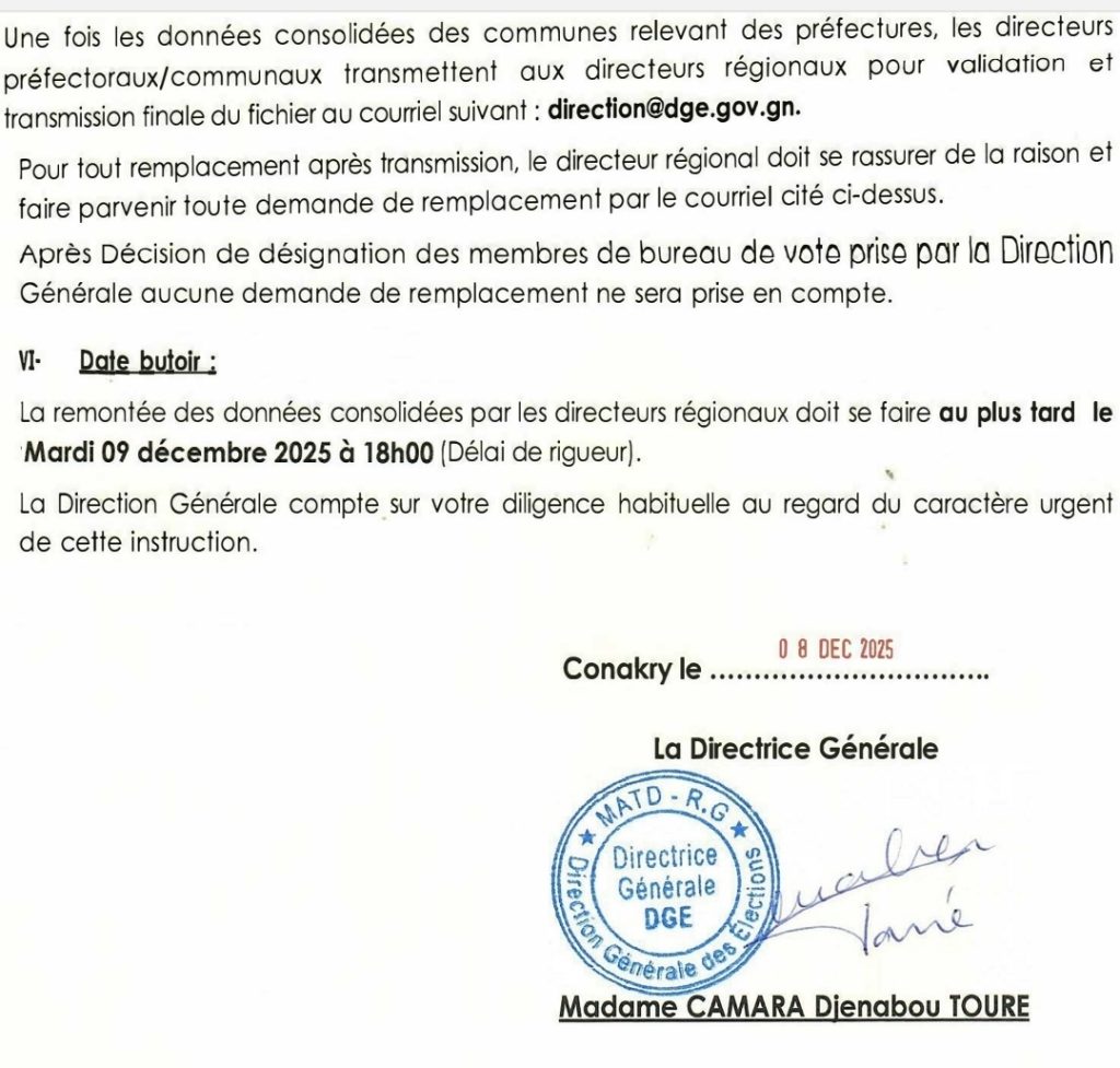 La directive est signée par la Directrice générale des élections, Mme Camara Djenabou Touré, qui appelle à une mise en œuvre rapide.
