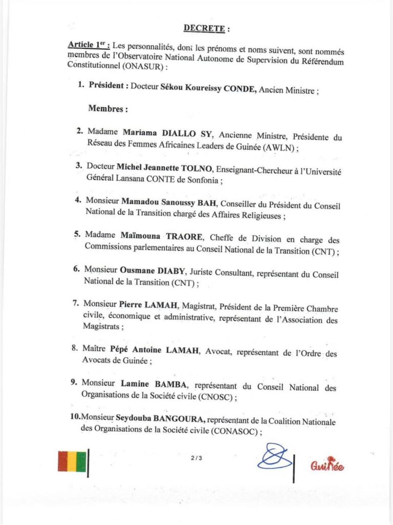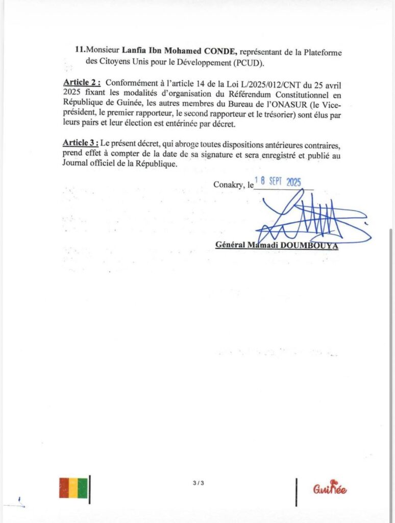 Par décret en date du 18 septembre 2025, le président de la République, le Général Mamadi Doumbouya, a procédé à la nomination des membres de l’Observatoire National Autonome de Supervision du Référendum (ONASUR).