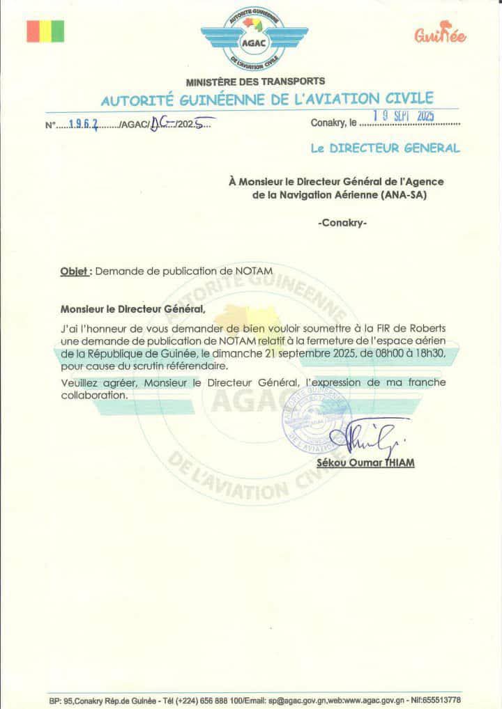À l’occasion du scrutin référendaire prévu ce dimanche 21 septembre 2025, l’Autorité Guinéenne de l’Aviation Civile (AGAC) a adressé une demande de publication de NOTAM à l’Agence de la Navigation Aérienne (ANA-SA). L’espace aérien guinéen sera fermé de 08h00 à 18h30 afin d’assurer le bon déroulement de l’événement.