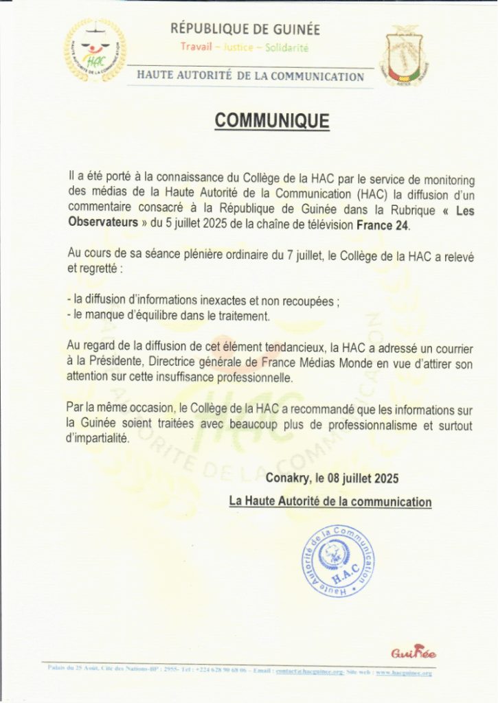 Dans un communiqué publié ce mardi 8 juillet 2025, la Haute Autorité de la Communication (HAC) a vivement réagi à un reportage diffusé par la chaîne France 24 dans sa rubrique Les Observateurs en date du 5 juillet 2025.