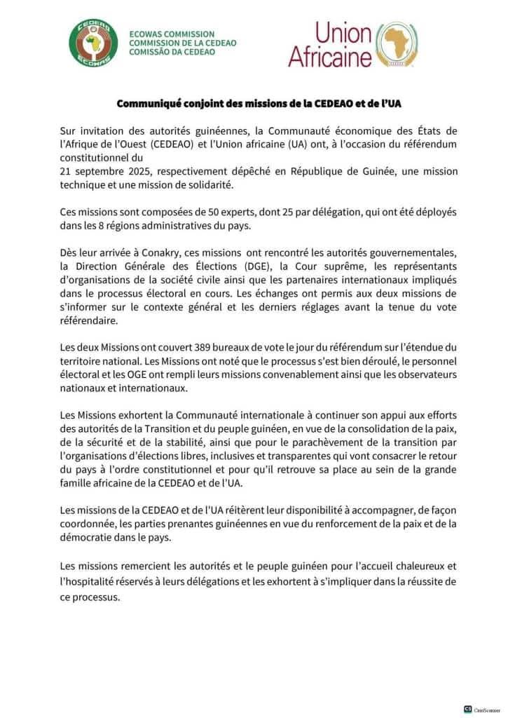 Sur invitation des autorités guinéennes, la Communauté économique des États de l’Afrique de l’Ouest (CEDEAO) et l’Union africaine (UA) ont, à l’occasion du référendum constitutionnel du 21 septembre 2025, respectivement dépêché en République de Guinée, une mission technique et une mission de solidarité.