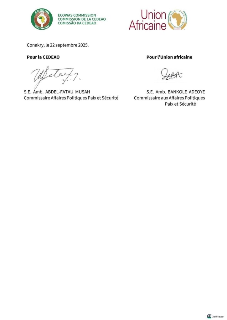 Les missions de la CEDEAO et de l’UA réitèrent leur disponibilité à accompagner, de façon coordonnée, les parties prenantes guinéennes en vue du renforcement de la paix et de la démocratie dans le pays.