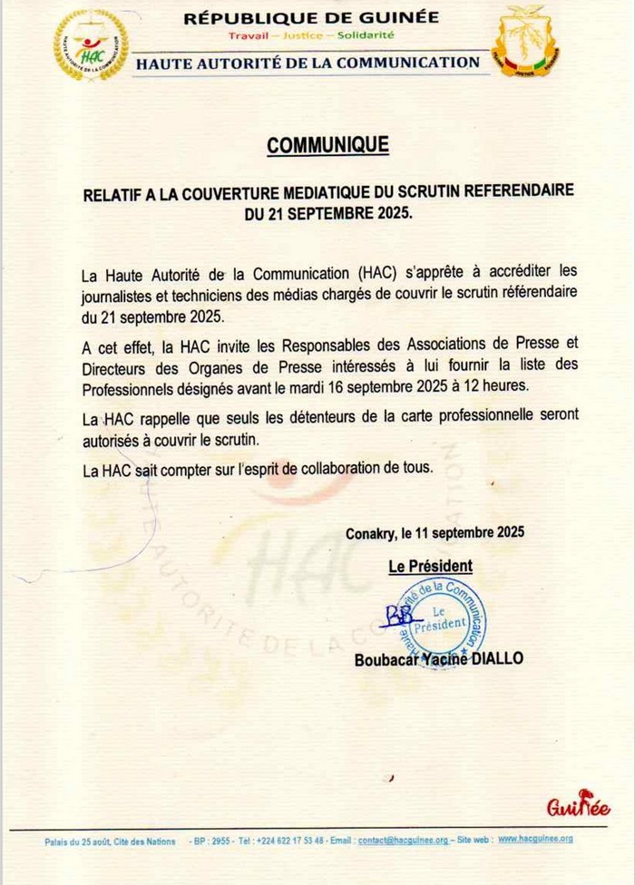 Le président de la HAC, Boubacar Yacine Diallo, souligne que cette démarche vise à assurer une couverture complète, transparente et professionnelle du référendum constitutionnel.