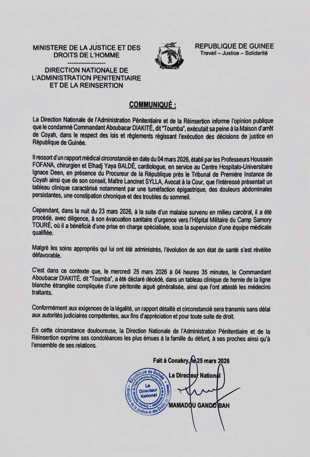 La Direction Nationale de l’Administration Pénitentiaire et de la Réinsertion a annoncé ce mercredi la mort du Commandant Aboubacar Diakité, survenue dans la nuit du 25 mars 2026, des suites de complications médicales alors qu’il purgeait sa peine à la maison d’arrêt de Coyah.Selon le communiqué officiel, le détenu était incarcéré dans le respect des lois en vigueur en République de Guinée.