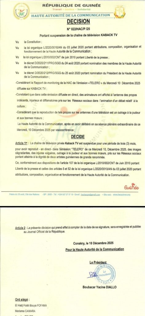 La Haute Autorité de la Communication (HAC) a annoncé, mercredi 10 décembre 2025, la suspension de la chaîne de télévision privée Kaback TV pour une durée de trois mois. Cette décision fait suite à la diffusion en direct, dans l’émission TELERO, d’images jugées « dégradantes », accompagnées « d’injures vulgaires » et d’un « outrage à la pudeur et aux bonnes mœurs ». Les séquences en cause, issues des réseaux sociaux, porteraient atteinte à la dignité de deux artistes de grande notoriété, selon l’instance de régulation.