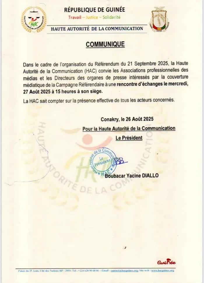 URGENT : la HAC invite les responsables d’associations et directeurs d’organes de presse à une rencontre. Société mardi 26 août 2025 FacebookInstagramTwitterYoutube À travers un communiqué, la Haute Autorité de de la Communication exhorte les responsables des associations de presse et les directeurs des organes de presse à une rencontre ce mercredi 27 aout 2025 à son siège à Kaloum. Facinet Soumah Partager FacebookTwitterPinterestWhatsAppLinkedinEmailImprimerTelegramViber Article précédentAgression du journaliste Daouda Bah : Le Ministre Fana Soumah au chevet de la victime et condamne cet acte.Article suivantÉvacuation sanitaire de Braima Camará : le Premier ministre de Guinée-Bissau transféré à Dakar après un malaise. Dernières Infos Journée nationale d’assainissement : Boké répond à l’appel des autorités ! Facinet Soumah - samedi 6 décembre 2025 INTERNATIONAL CE DOCUMENT DÉVOILÉ PAR LA MAISON BLANCHE QUI FAIT FRÉMIR L’EUROPE, VOICI POURQUOI. Facinet Soumah - samedi 6 décembre 2025 Société Incendie du dépôt d’hydrocarbures de Kaloum : le FMI débloque 5 millions USD pour soutenir les sinistrés à travers la Facilité de Crédit Rapide... Facinet Soumah - vendredi 5 décembre 2025 Société Journée citoyenne d’assainissement : important communiqué. Facinet Soumah - vendredi 5 décembre 2025 ARTICLES CONNEXES Société Journée nationale d’assainissement : Boké répond à l’appel des autorités ! samedi 6 décembre 2025 Société Incendie du dépôt d’hydrocarbures de Kaloum : le FMI débloque 5 millions USD pour soutenir les sinistrés à travers la Facilité de Crédit Rapide... vendredi 5 décembre 2025 Société Journée citoyenne d’assainissement : important communiqué. vendredi 5 décembre 2025 Société Enlèvement de son directeur adjoint de campagne : le Bloc Libéral dénonce et met en garde les autorités. jeudi 4 décembre 2025 LAISSER UN COMMENTAIRE Annuler la réponse Commenter : S'il vous plaît entrez votre commentaire! Nom :* S'il vous plaît entrez votre nom ici Email :* Vous avez entré une adresse email incorrecte! Veuillez entrer votre adresse email ici Site : Δ