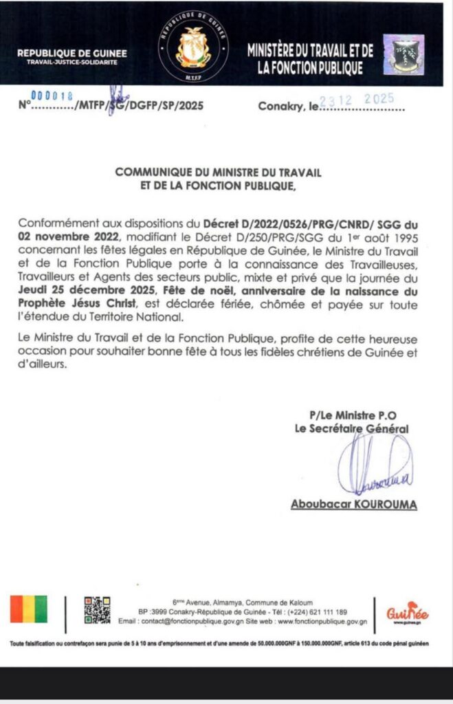 Dans un communiqué rendu public ce mercredi, le Ministère du Travail et de la Fonction Publique (MTFP) informe l’ensemble des travailleuses et travailleurs de la République de Guinée que la journée du jeudi 25 décembre 2025 est officiellement déclarée jour férié, chômé et payé.