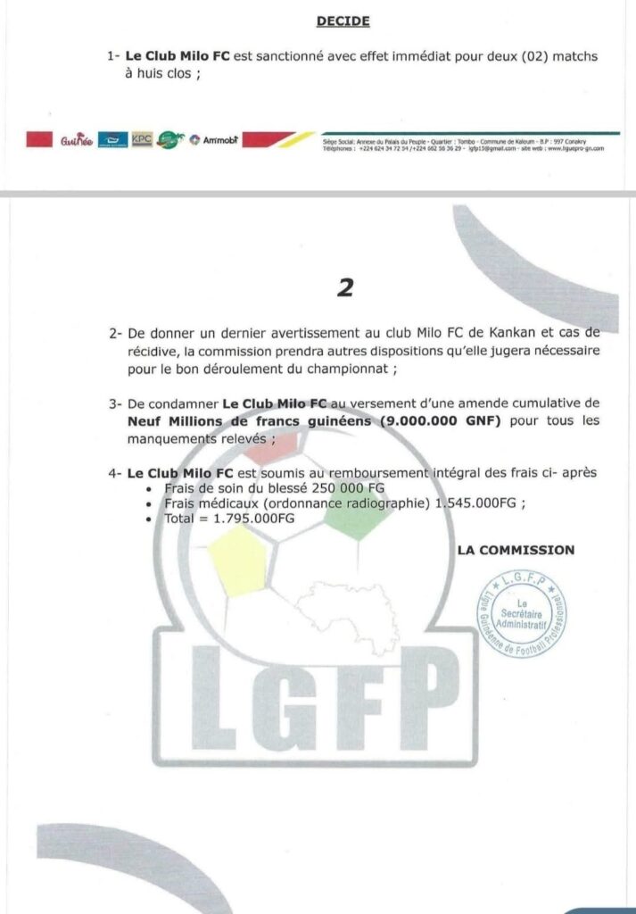 Désormais, c’est officiel. À travers une correspondance, la LGFP, dirigée par le président Elhadj Diomandé, vient de sanctionner le Milo Football Club et l’AS Kaloum. En effet, le Milo recevait le Wakriya AC à domicile en marge de la 5ᵉ journée, une rencontre qui s’est soldée par des violences à l’égard des joueurs du Wakriya. Quelques jours après ces incidents, la Ligue a décidé d’infliger au Milo FC une amende de 9 millions FG, plus 2 rencontres à huis clos.