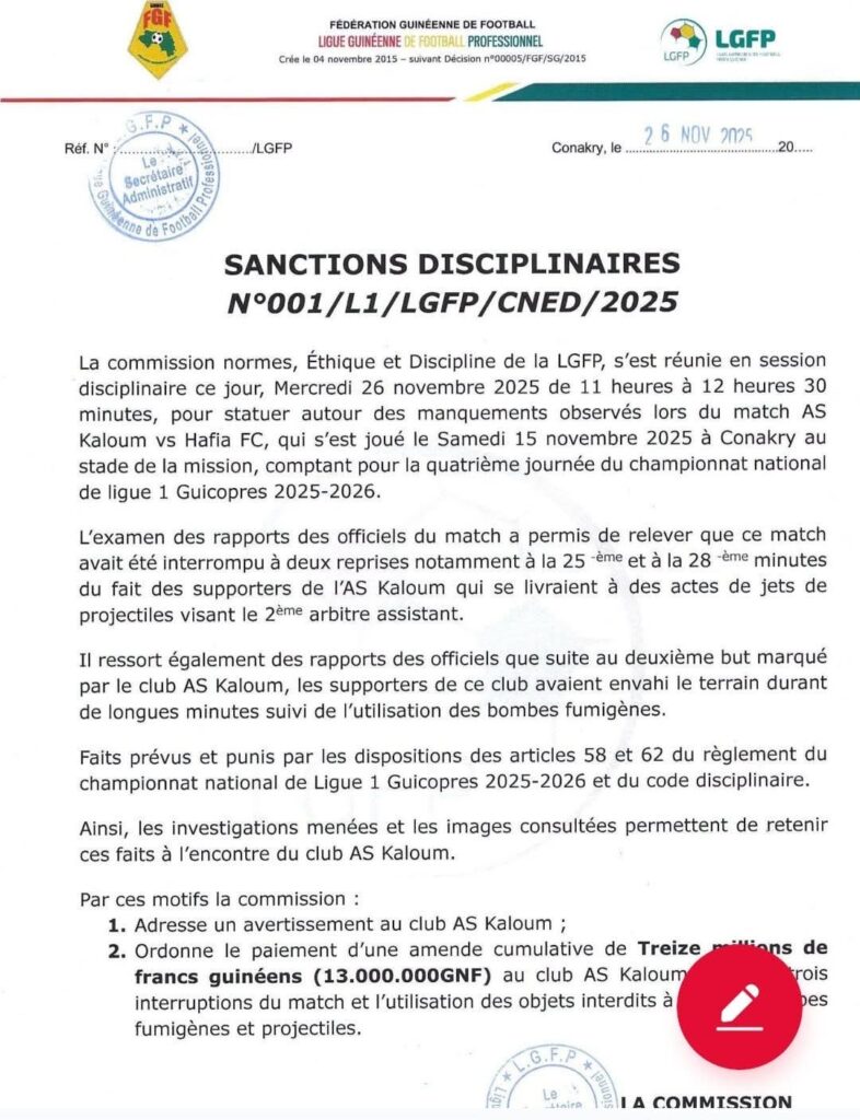 L’AS Kaloum, sous la houlette du coach Désiré Focou, est également sanctionnée par la Ligue. Lors de son match de la 4ᵉ journée contre le Hafia FC, au stade de la Mission, il y a eu un envahissement de terrain par les supporters de l’AS Kaloum ainsi que trois (3) interruptions de la rencontre. C’est ainsi que la Ligue a décidé d’infliger une lourde amende de 13 millions FG aux Kaloumistes.