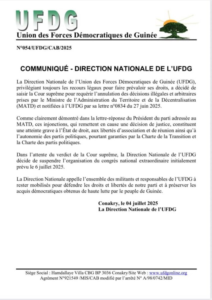 URGENT : L’UFDG suspend son congrès prévu le 6 juillet et saisi la cour suprême. Politique vendredi 4 juillet 2025 FacebookInstagramTwitterYoutube Cellou Dalein Diallo Président UFDG Partager FacebookTwitterPinterestWhatsAppLinkedinEmailImprimerTelegramViber Article précédentGuinée : la variole du singe refait surface avec 49 cas confirmésArticle suivantMETFPE : Quinze formateurs de l’enseignement technique en partance pour une mission de perfectionnement en Côte d’Ivoire Dernières Infos LABÉ : le Contrôleur général de Police Cheick Mohamed Keïta nommé nouveau préfet. Facinet Soumah - samedi 6 décembre 2025 Société Journée nationale d’assainissement : Boké répond à l’appel des autorités ! Facinet Soumah - samedi 6 décembre 2025 INTERNATIONAL CE DOCUMENT DÉVOILÉ PAR LA MAISON BLANCHE QUI FAIT FRÉMIR L’EUROPE, VOICI POURQUOI. Facinet Soumah - samedi 6 décembre 2025 Société Incendie du dépôt d’hydrocarbures de Kaloum : le FMI débloque 5 millions USD pour soutenir les sinistrés à travers la Facilité de Crédit Rapide... Facinet Soumah - vendredi 5 décembre 2025 ARTICLES CONNEXES Politique LABÉ : le Contrôleur général de Police Cheick Mohamed Keïta nommé nouveau préfet. samedi 6 décembre 2025 Politique Décret présidentiel : Vaste mouvement au commandement de la Gendarmerie à Kankan et N’Zérékoré (Liste). jeudi 4 décembre 2025 Politique Dernière minute / Police Nationale : Le Président Doumbouya procède à d’Importants mouvements régionaux (Liste). jeudi 4 décembre 2025 Politique Guinée : Général Mamadi Doumbouya nomme de nouveaux commandants aux régions militaires. mercredi 3 décembre 2025 LAISSER UN COMMENTAIRE Annuler la réponse Commenter : S'il vous plaît entrez votre commentaire! Nom :* S'il vous plaît entrez votre nom ici Email :* Vous avez entré une adresse email incorrecte! Veuillez entrer votre adresse email ici Site : Δ