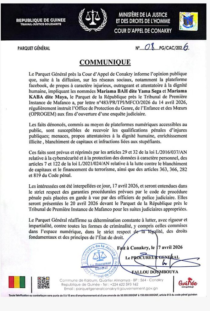 Le Parquet Général près la Cour d’Appel de Conakry informe l’opinion publique que, suite à la diffusion, sur les réseaux sociaux, notamment la plateforme Facebook, de propos à caractère injurieux, outrageant et attentatoire à la dignité humaine, impliquant les nommées Mariama BAH dite Yama Sega et Mariama KABA dite Maya, le Parquet de la République près le Tribunal de Première Instance de Mafanco a, par lettre n°483/PR/TPI/MFCO/2026 du 14 avril 2026, régulièrement instruit l’Office de Protection du Genre, de l’Enfance et des Mœurs (OPROGEM) aux fins d’ouverture d’une enquête judiciaire.
