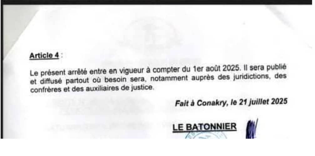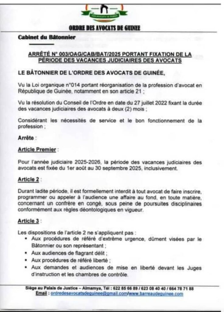 Le bâtonnier de l’Ordre des avocats de Guinée, Maître Mamadou Souré Diop, a officiellement annoncé ce lundi 21 juillet 2025 la période des vacances judiciaires pour l’année en cours.