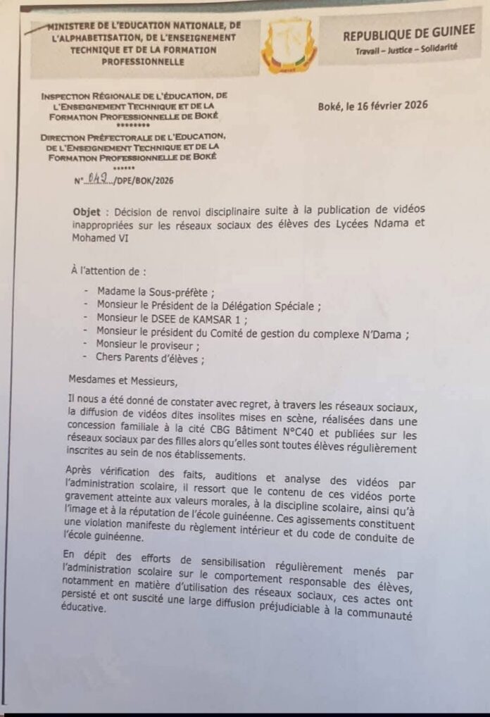 La Direction Préfectorale de l’Éducation de Boké a annoncé, par une décision datée du 16 février 2026, des sanctions disciplinaires majeures à l’encontre de plusieurs élèves des lycées Ndama et Mohamed VI.