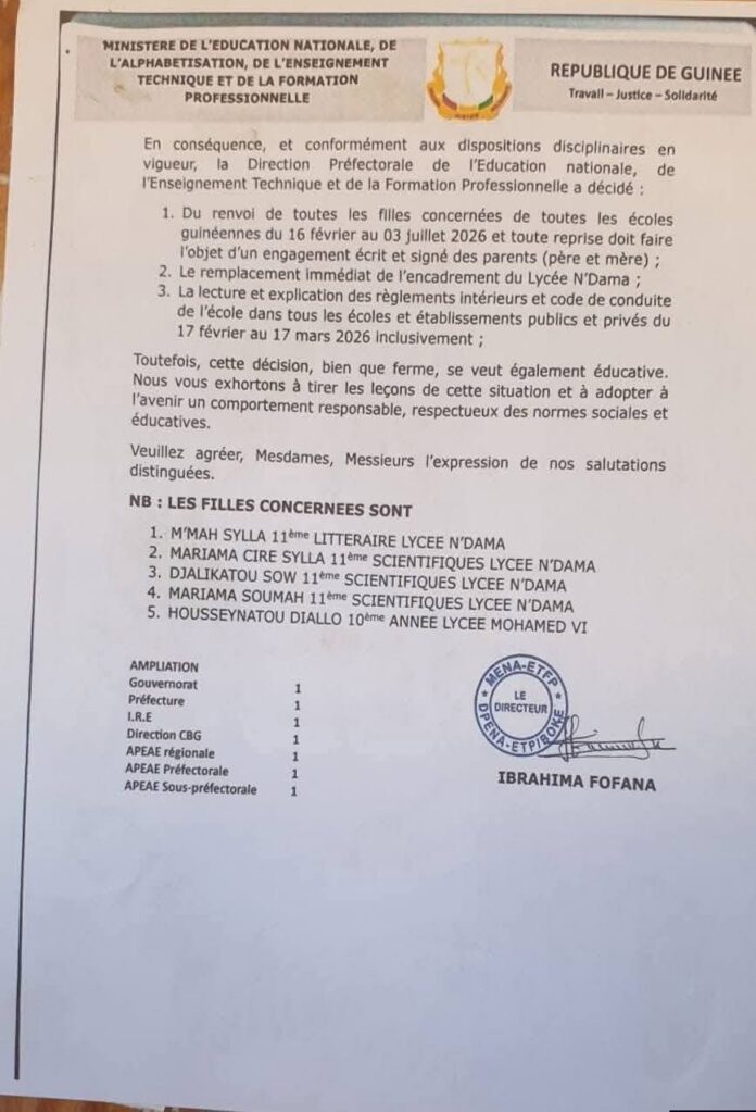 - Renvoi immédiat : Cinq jeunes filles (listées ci-dessous) sont renvoyées de toutes les écoles guinéennes du 16 février au 3 juillet 2026.