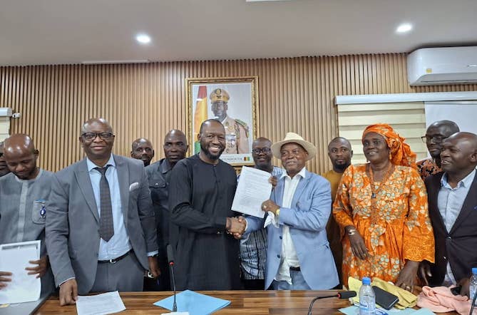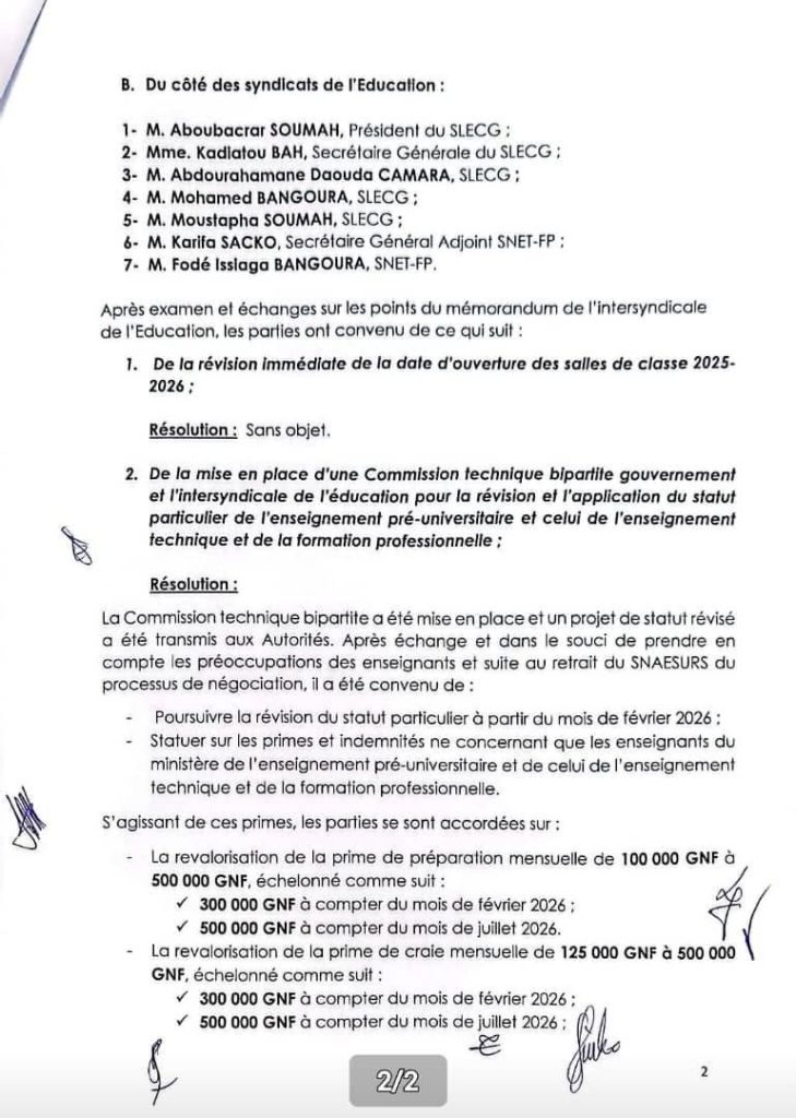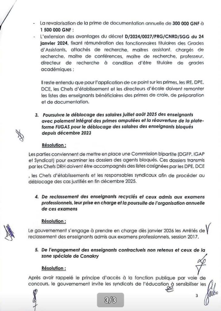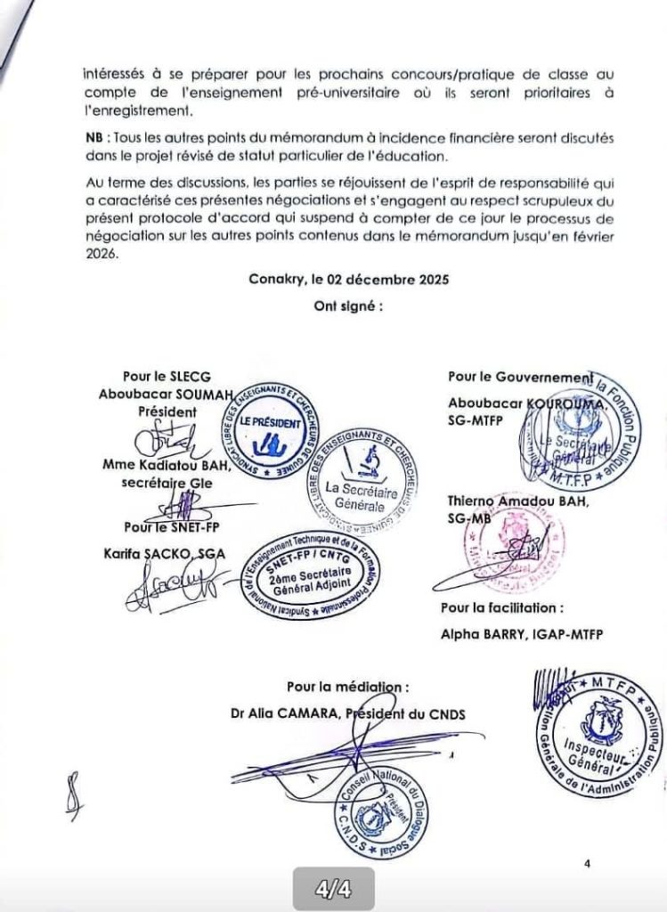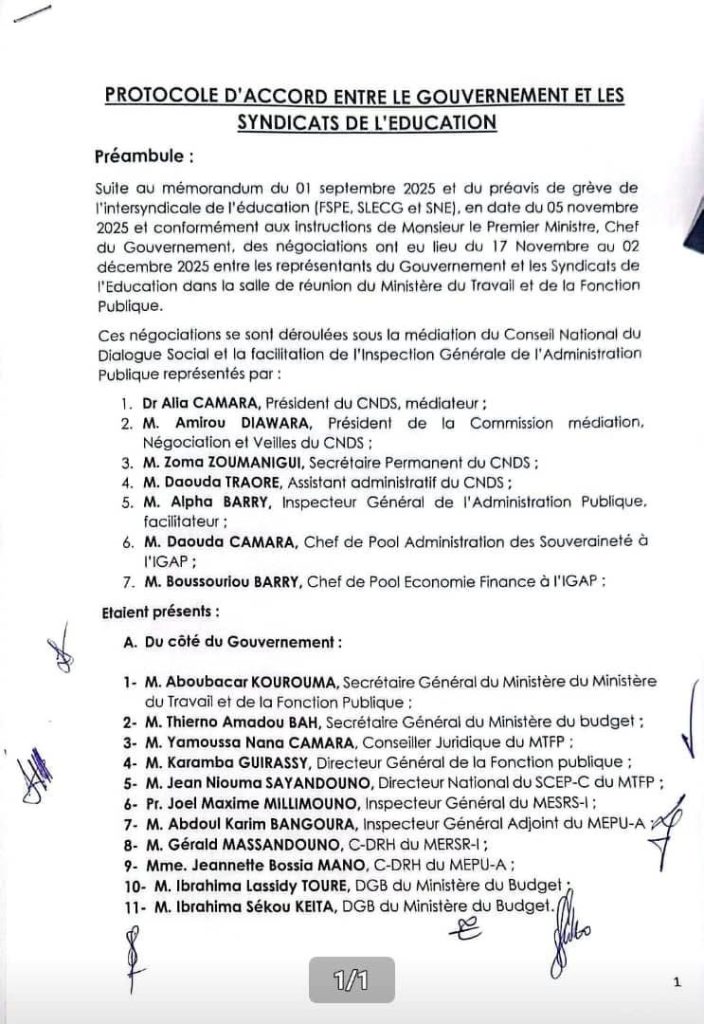 Voici le protocole d’accord signé entre le gouvernement et l’intersyndicale. Education mardi 2 décembre 2025 FacebookInstagramTwitterYoutube L’intersyndicale de l’éducation et le gouvernement se sont finalement mis d’accord sur un protocole d’accord. Après plusieurs heures de discussion, les parties ont procédé à la signature du document. Partager FacebookTwitterPinterestWhatsAppLinkedinEmailImprimerTelegramViber Article précédentDernière minute : Abdoulaye Sow, figure de l’USTG, meurt après une courte maladie.Article suivantDécès d’Abdoulaye Sow : la réaction d’Amadou Diallo, président du Mouvement Syndical Guinéen (MSG). Dernières Infos Journée nationale d’assainissement : Boké répond à l’appel des autorités ! Facinet Soumah - samedi 6 décembre 2025 INTERNATIONAL CE DOCUMENT DÉVOILÉ PAR LA MAISON BLANCHE QUI FAIT FRÉMIR L’EUROPE, VOICI POURQUOI. Facinet Soumah - samedi 6 décembre 2025 Société Incendie du dépôt d’hydrocarbures de Kaloum : le FMI débloque 5 millions USD pour soutenir les sinistrés à travers la Facilité de Crédit Rapide... Facinet Soumah - vendredi 5 décembre 2025 Société Journée citoyenne d’assainissement : important communiqué. Facinet Soumah - vendredi 5 décembre 2025 ARTICLES CONNEXES Education Dernière minute : l’intersyndicale SNE–FSPE rejette le protocole d’accord et annonce la poursuite de la grève. mercredi 3 décembre 2025 Education Crise à l’Éducation : la FSPE et le SNE torpillent l’accord SLECG-Gouvernement. mardi 2 décembre 2025 Education Mouvement de grève dans l’éducation : les écoles de Yimbaya fortement perturbées malgré les réserves du SLECG. lundi 1 décembre 2025 Education Grève des enseignants à Kankan : plusieurs lycées publics paralysés, les cours annulés. lundi 1 décembre 2025 LAISSER UN COMMENTAIRE Annuler la réponse Commenter : S'il vous plaît entrez votre commentaire! Nom :* S'il vous plaît entrez votre nom ici Email :* Vous avez entré une adresse email incorrecte! Veuillez entrer votre adresse email ici Site : Δ