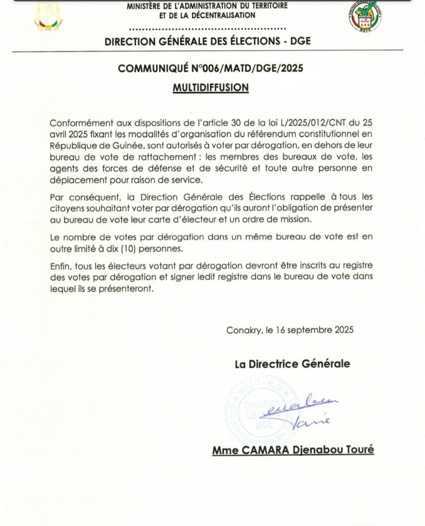 Quelques jours seulement nous séparent du jour du vote référendaire, le 21 septembre 2025. A cet effet, la Direction générale des Élections (DGE) a tenu à apporter des clarifications quant aux dispositions relatives au vote par dérogation, prévues dans le cadre du référendum constitutionnel en République de Guinée.